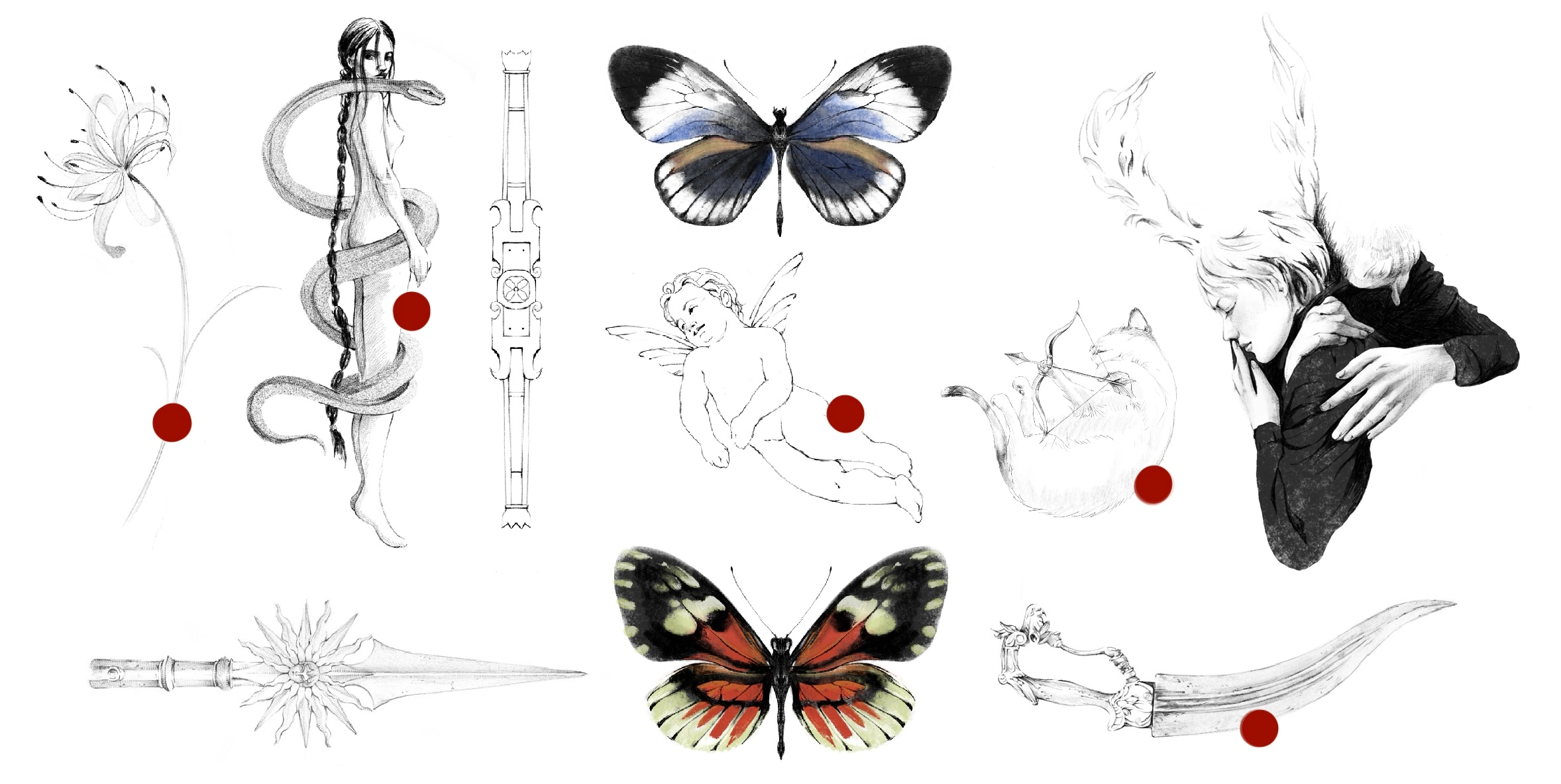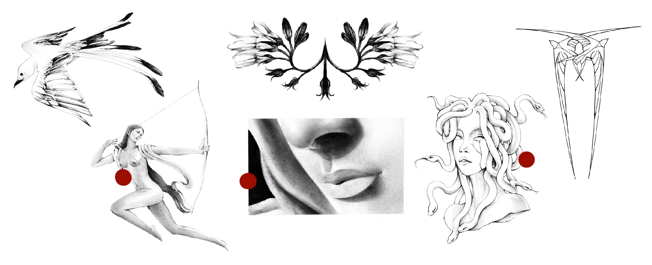 A la croisée du cinéma et de l’architecture, ma passion s’est enchevêtrée dans l’art du tatouage, où j’apprécie également figer dans la peau d’autrui l’encre au sang, marquant un souvenir, un rituel. Influencée par des épopées, des mythologies, des herbiers, de curiosités mais aussi d'histoires, contées dans les films ou les écrits, je propose un catalogue de flash issu de mon univers, prêt à être adoptés, comme on garderait un extrait de contes, comme on arborerait une broderie comme parure. Je suis également disponible pour mettre mon trait de crayon à profit de vos projets personnels, afin de faire fleurir en collaboration vos idées.
